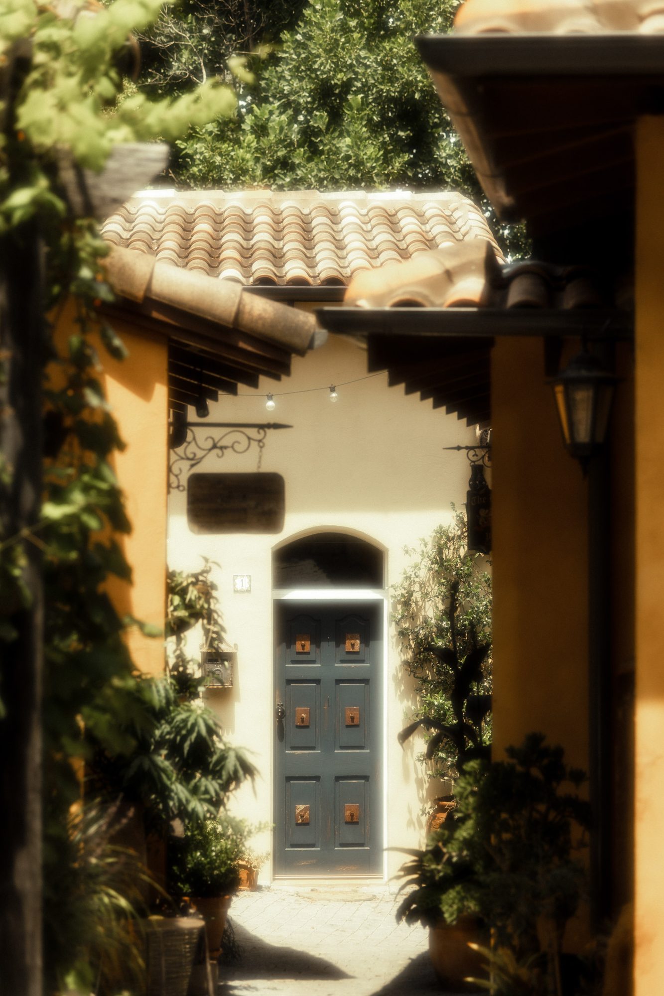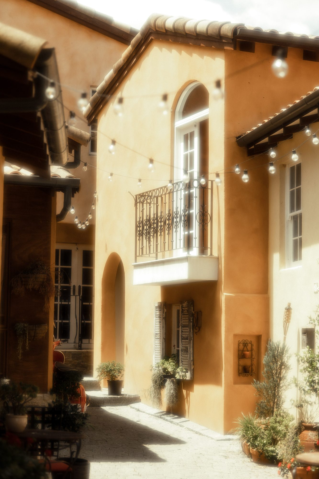 - Cobblestone streets under festoon lights