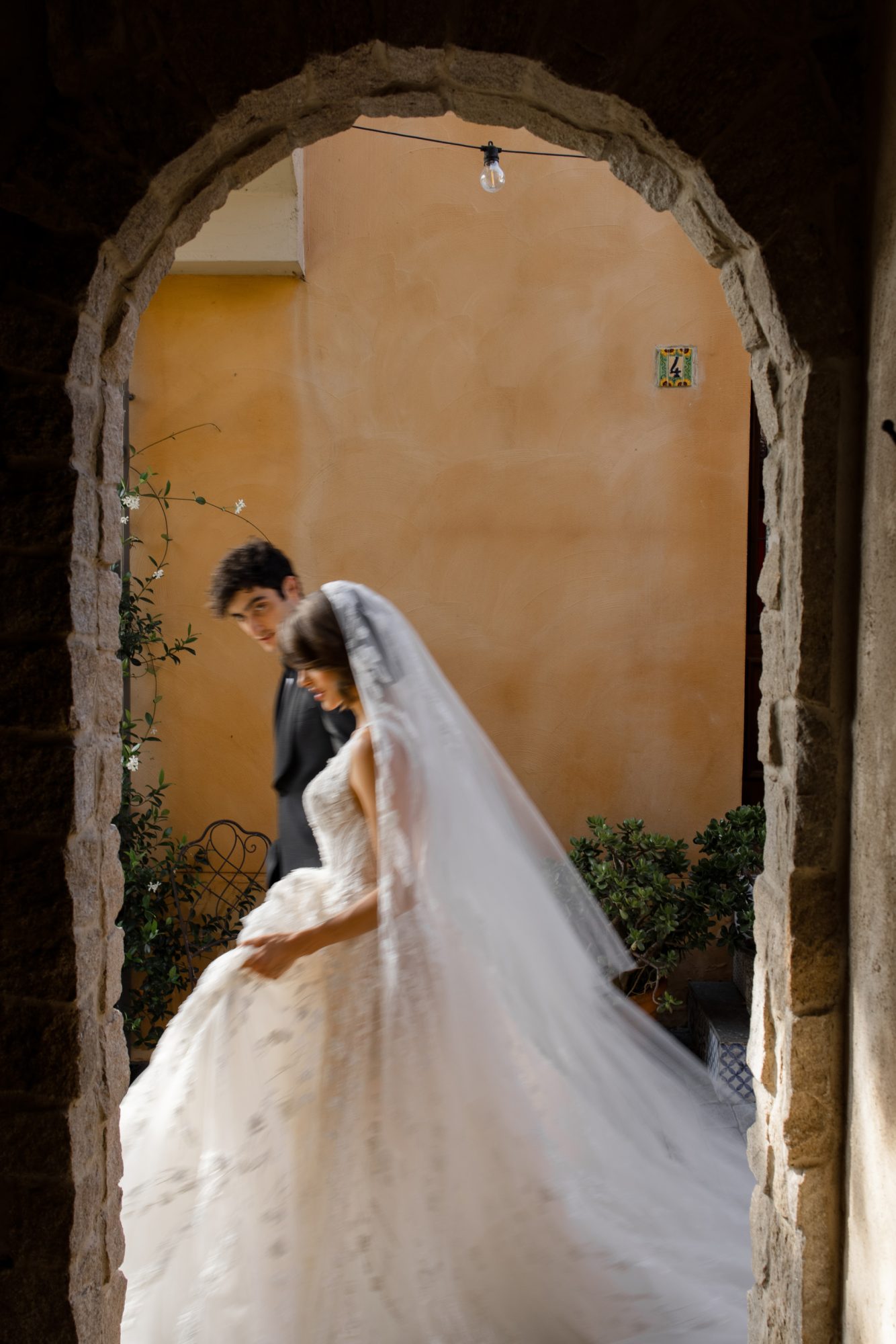 - Under a curved brick arch